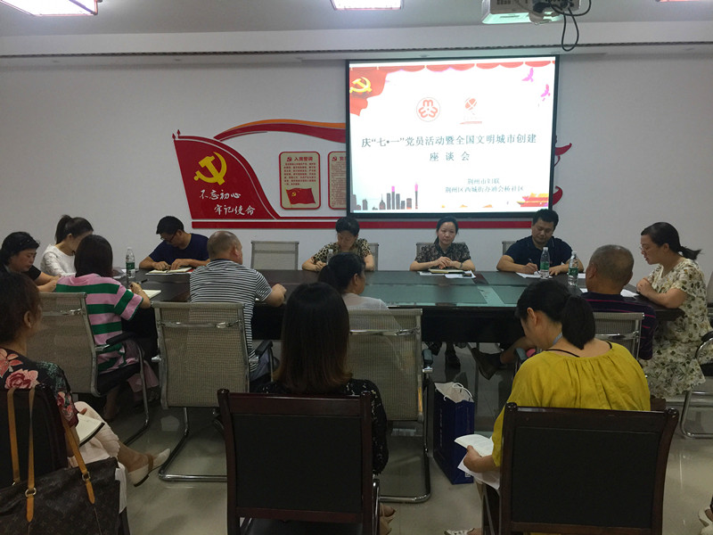 7月3日上午,市妇联联合通会桥社区开展庆七一党员活动暨全国文明城市创建座谈会,市妇联机关全体党员、社区两委班子和部分老党员代表参加了座谈会。与会同志一起重温了入党誓词,学习了荆组办[2018]7号《关于进一步发挥基层党组织和党员作用助力全国文明城市创建工作的通知》,了解了社区基本情况,市妇联部分党员和社区老党员代表结合自身岗位实际,就如何发挥党员先锋模范作用,助力全国文明城市创建进行了交流发言。社区老党员代表认为要加强创文宣传,提高市民素质,文明行为要坚持,不能是短期行为,创文工作人人有责,呼吁广大居民朋友加入创文志愿者的队伍,服务社区,服务创文工作。市妇联党员代表结合妇联工作职能,从家庭源头上做好文明教育、宣传、引导,发挥巾帼志愿者的作用,建设平安、和谐家庭和社会等三个方面进行了交流。